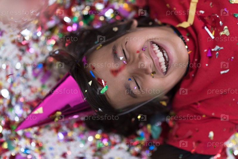 Ребенок с конфетти на полу