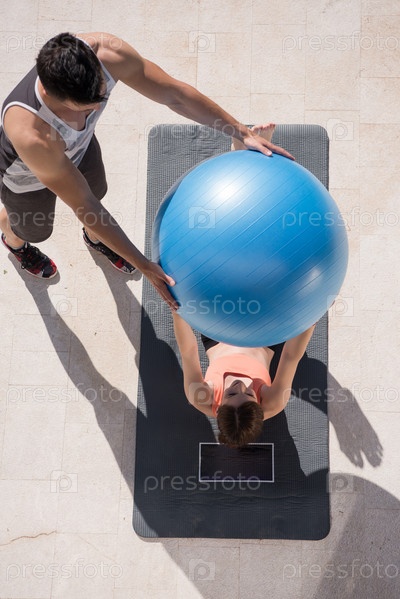 Женщина и личный тренер делает упражнение с мячом пилатес