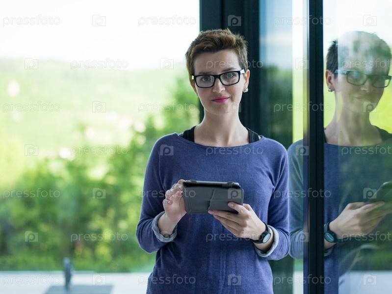 Молодая женщина с планшетом у окна