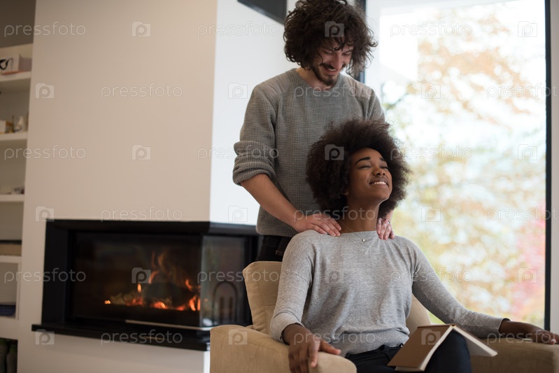 Пара обнимается перед камином