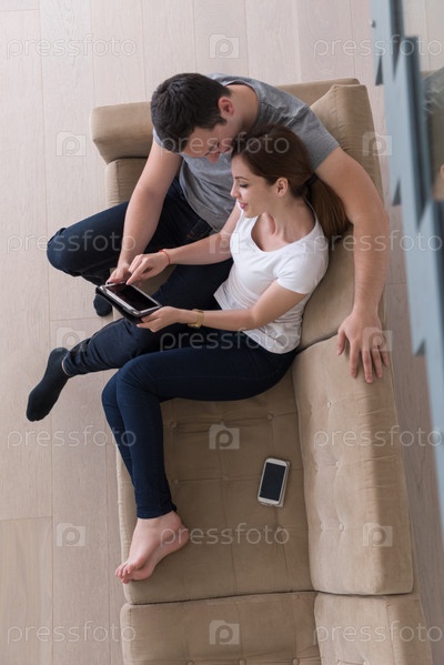 Пара отдыхает дома с планшетом