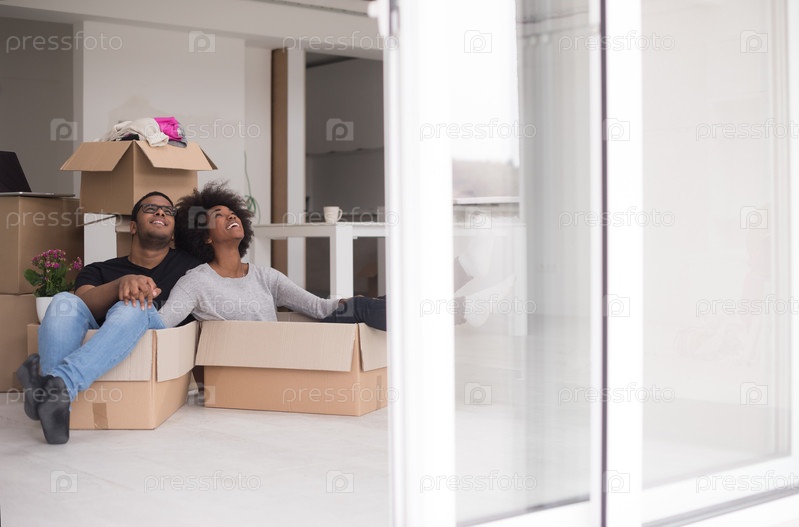 Молодая веселая пара в новом доме