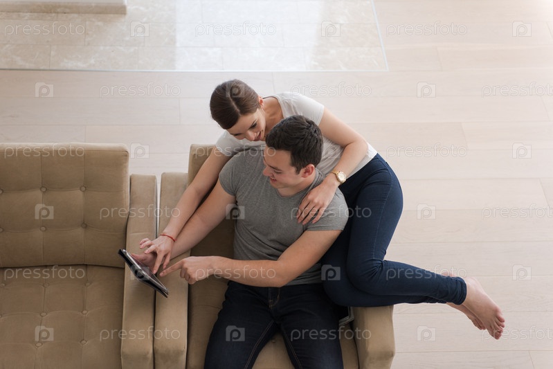 Пара отдыхает дома с планшетом