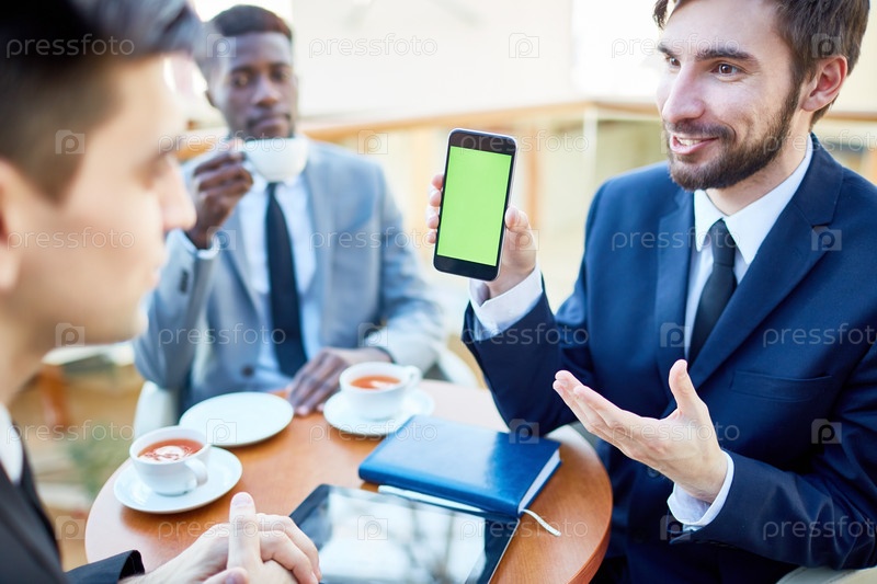 Жизнерадостный бизнесмен показывает мобильное приложение коллегам