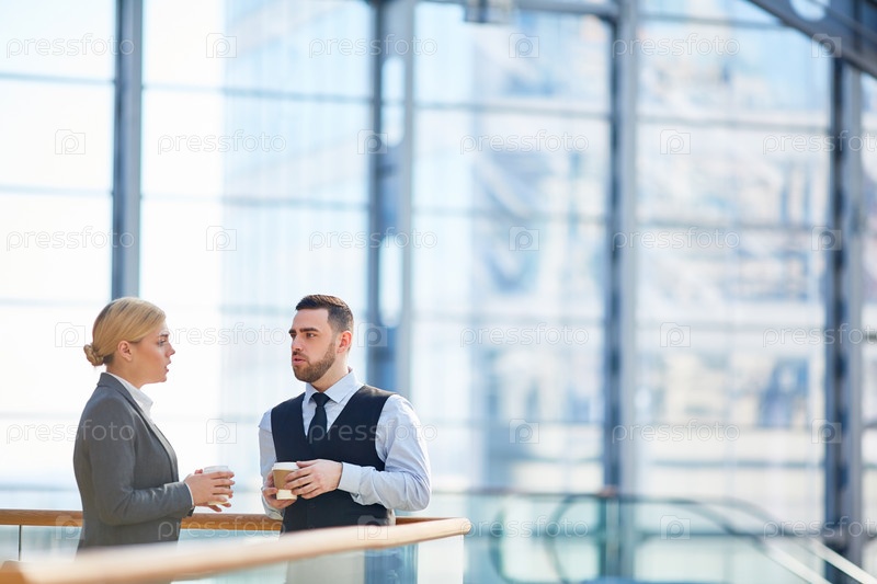 Деловой человек и женщина обсуждают работу в стеклянном зале