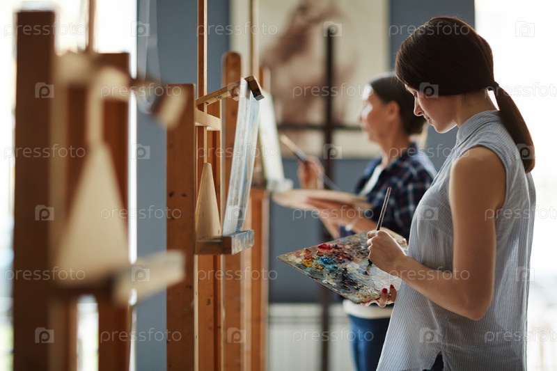Молодая женщина смешивает цвета на палитре для рисовании
