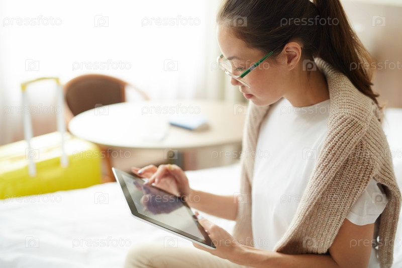 Женщина с планшетом в спальне