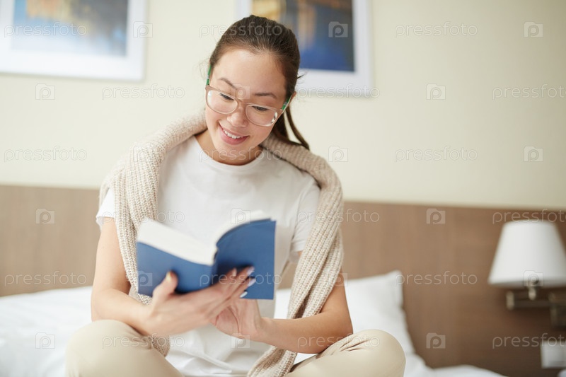 Молодая азиатская женщина читает на кровати
