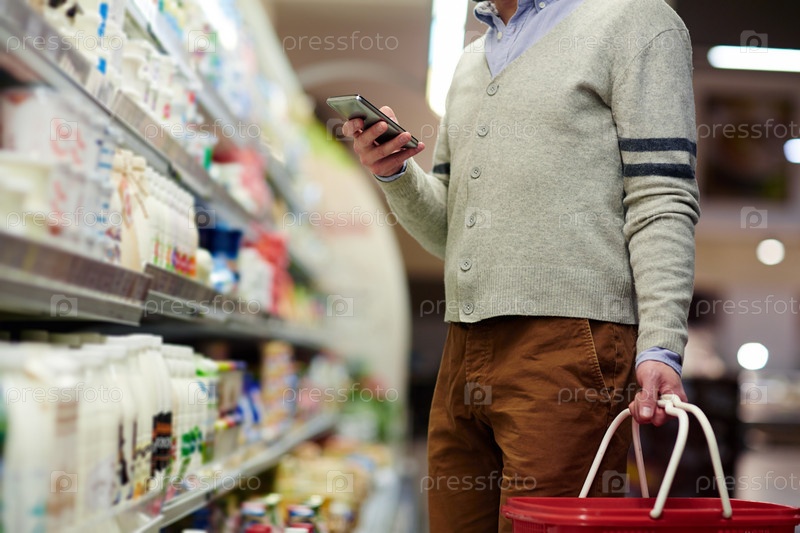 Мужчина, использующий смартфон при покупке продуктов питания