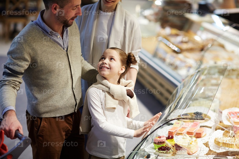 Симпатичная девочка, выбирающая сладости в магазине