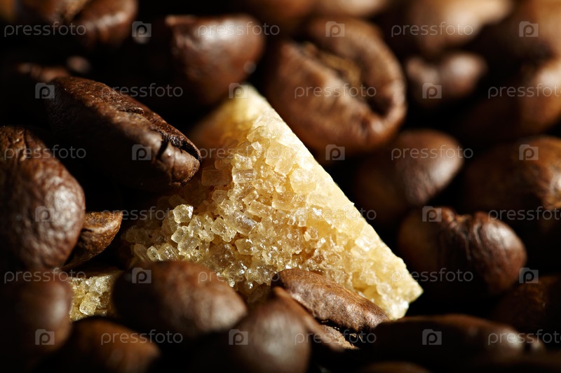 Кофейные зерна и кубики коричневого сахара, утренний свет