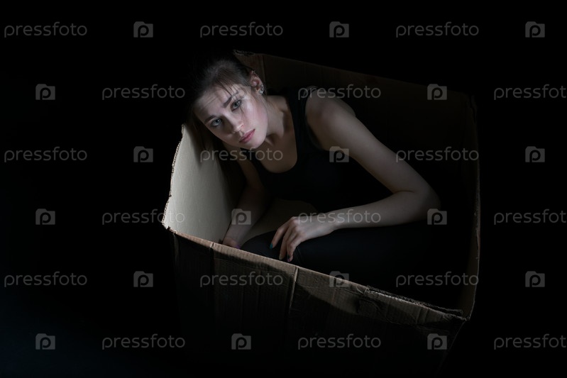 Грустная молодая девушка в картонной коробке