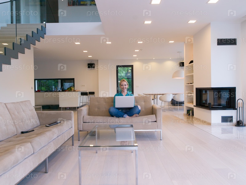 Молодая женщина, используя ноутбук дома