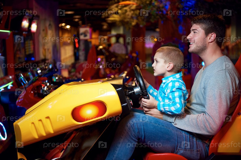 Отец и сын играют на автомате