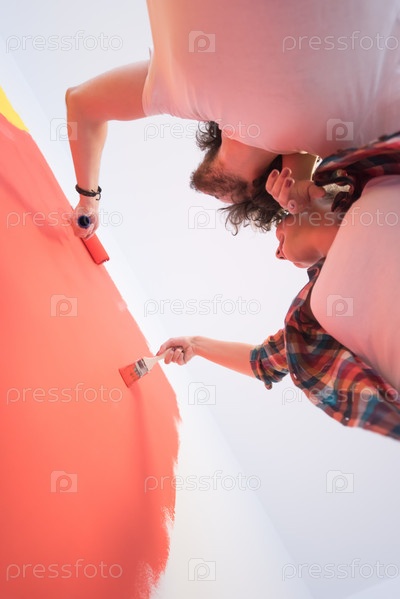 Счастливая пара красит стену