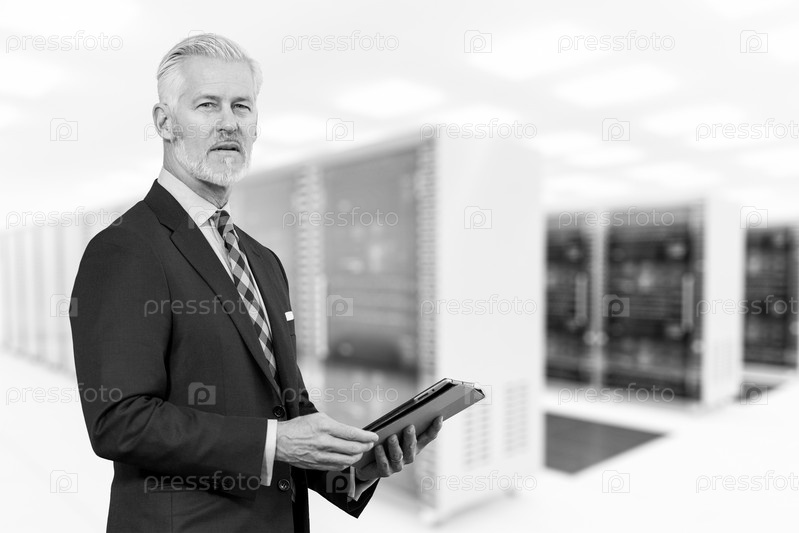 Зрелый бизнесмен в серверной комнате