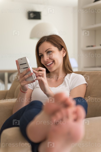 Женщина на диване с телефоном