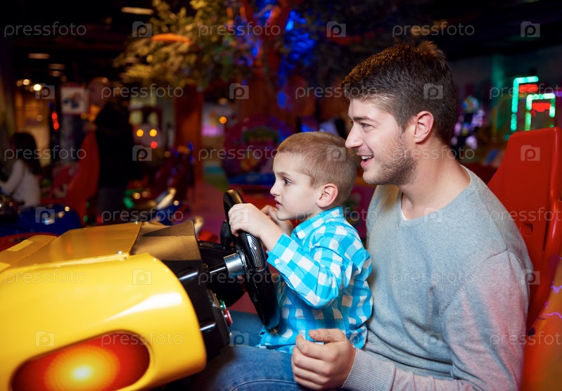Отец и сын за игровым автоматом