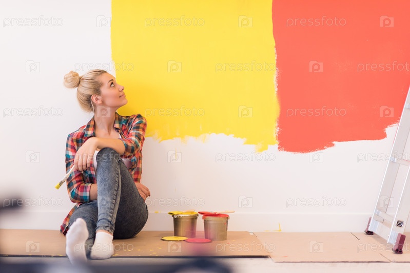 Молодая женщина художник, сидя на полу