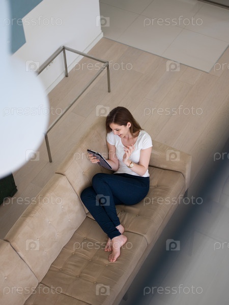 Женщина, сидящая на диване с планшетом