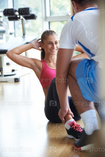 Молодая спортивная женщина с инструктором в тренажерном зале