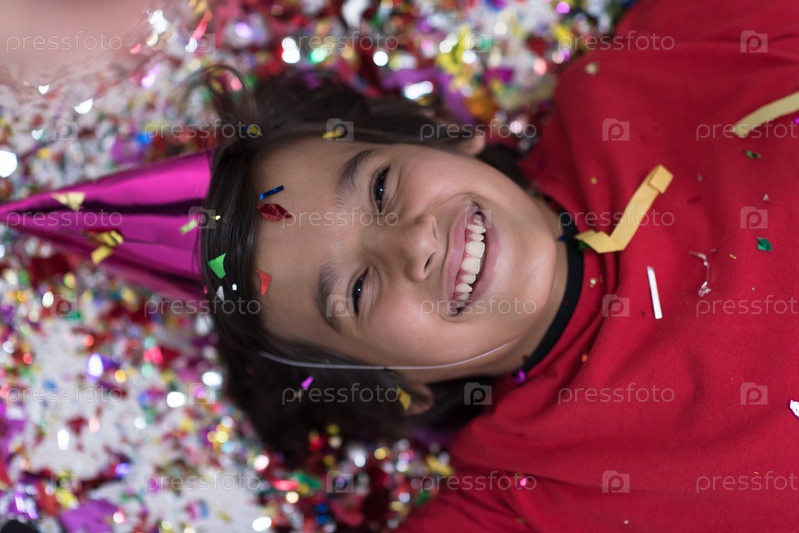 Ребенок с конфетти, лежа на полу