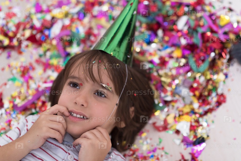 Ребенок с конфетти, лежа на полу