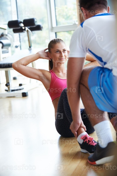 Молодая спортивная женщина с инструктором в тренажерном зале