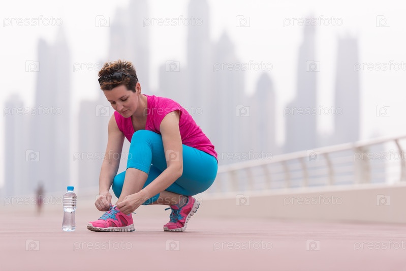 Женщина, завязывающая шнурки на кроссовках