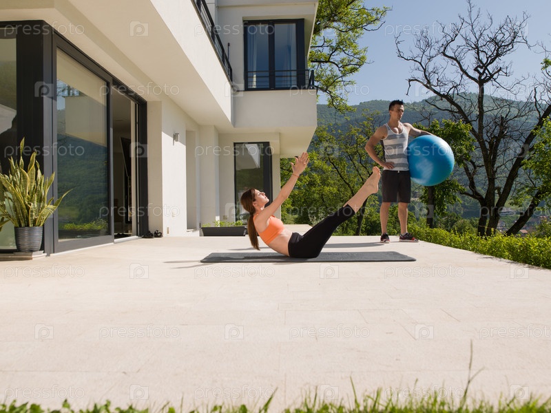 Женщина и личный тренер делает упражнение с мячом пилатес