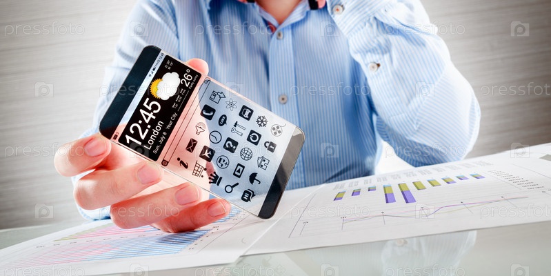 Смартфон с прозрачным экраном в руке