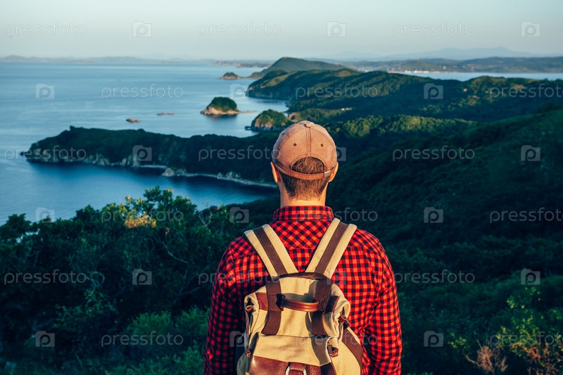 Путешественник со спины на берегу моря