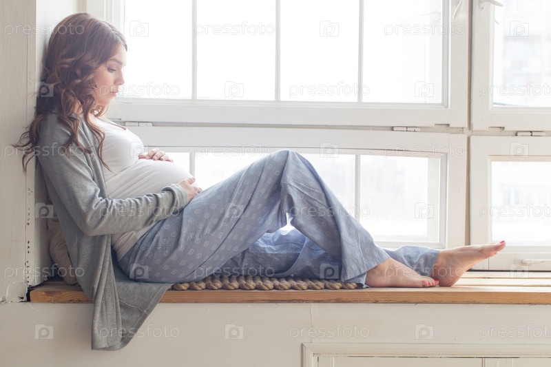 Беременная женщина сидит на подоконнике