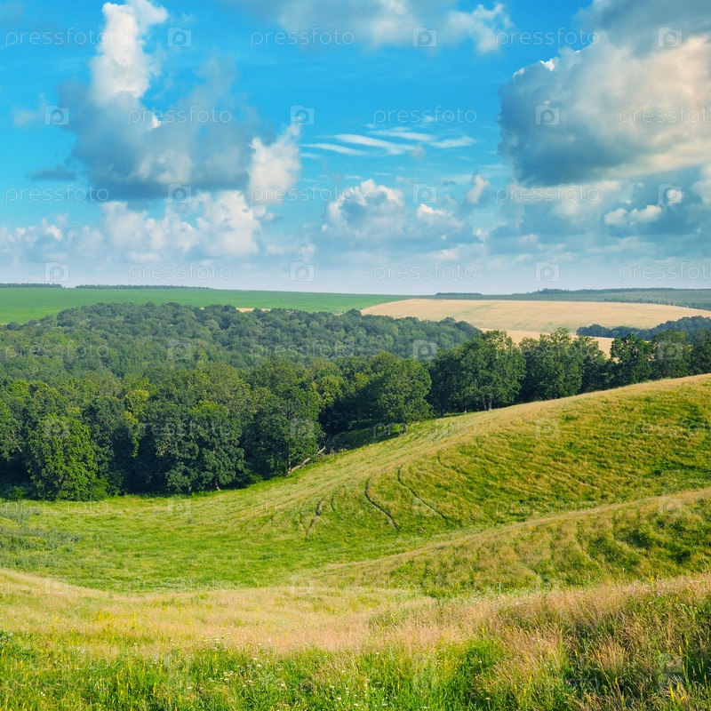 Живописные холмы, лес и голубое небо