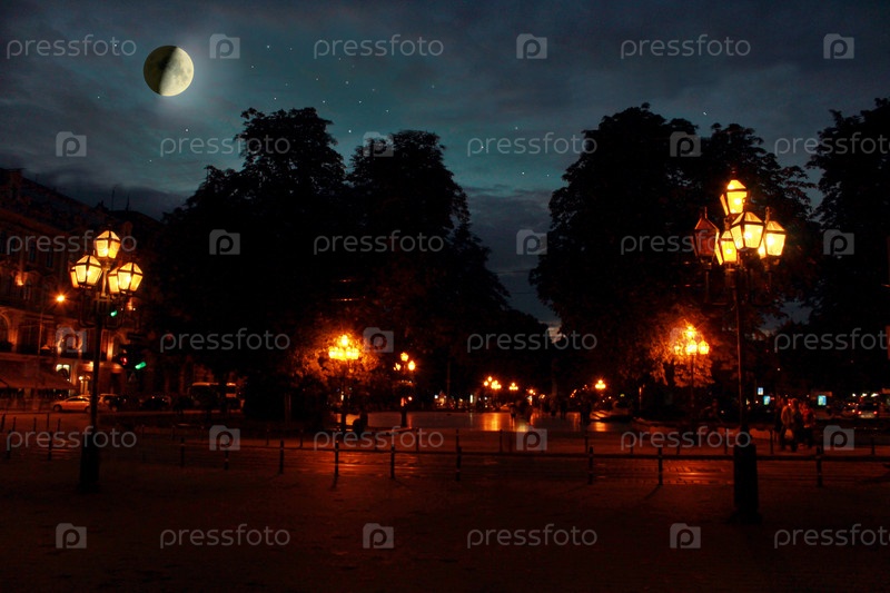 Луна с сияющими звездами над ночным городом