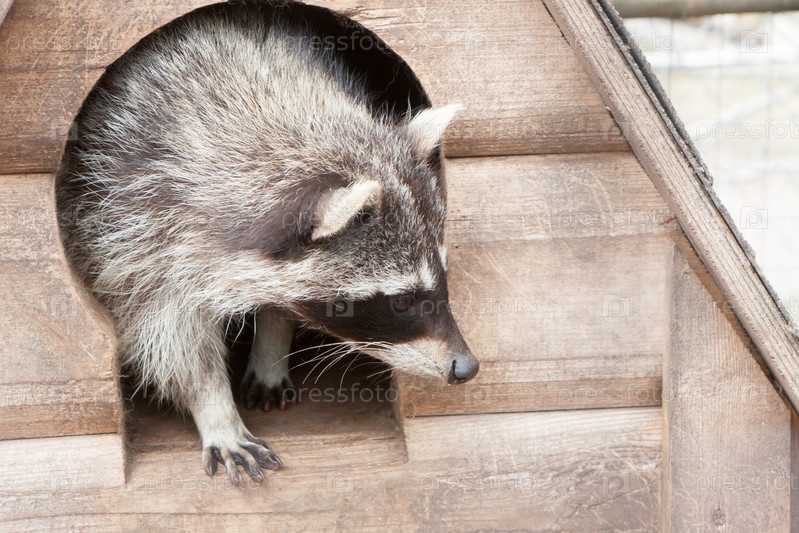 Портрет енота, который выходит из деревянного домика