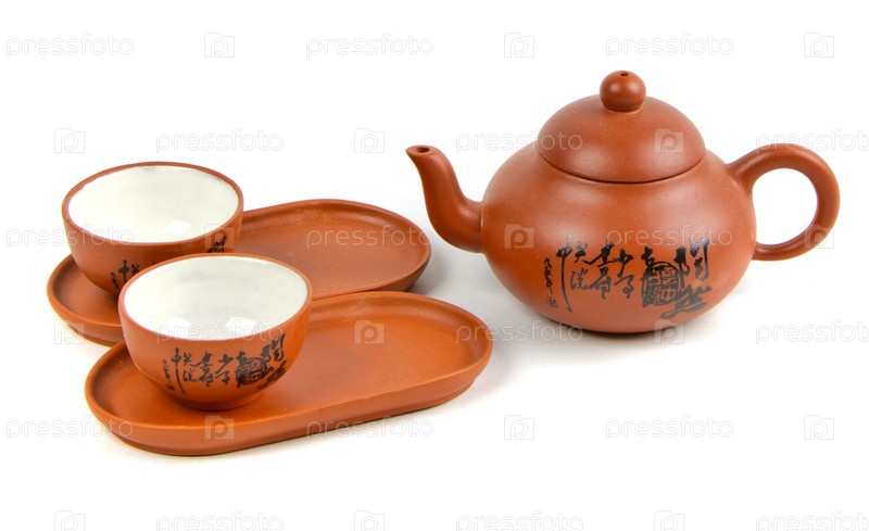 Глиняный чайник с чашками