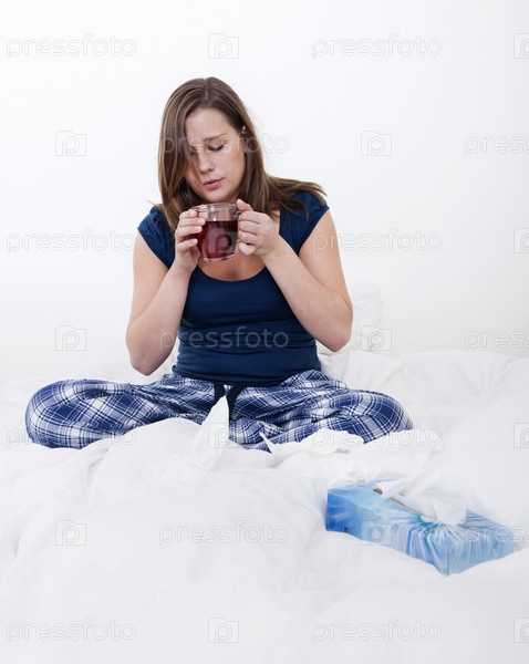 Простуженная молодая женщина с чашкой чая сидит в постели