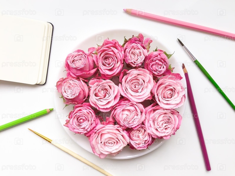 Красочная композиция с розами, альбомом и аксессуарами