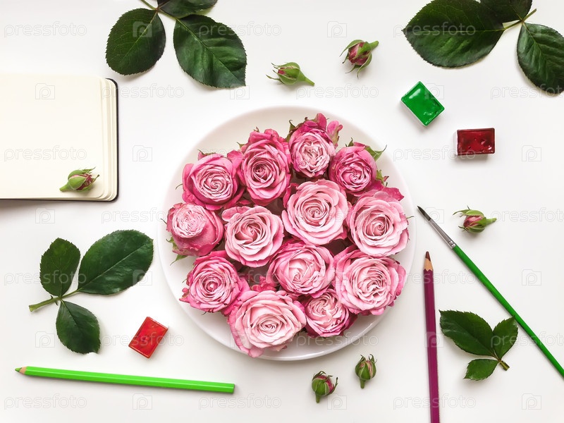 Красочная композиция с альбомом, розами и аксессуарами