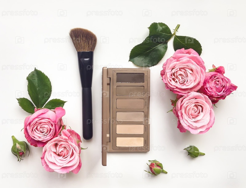 Декоративная композиция с косметикой и цветами на белом фоне