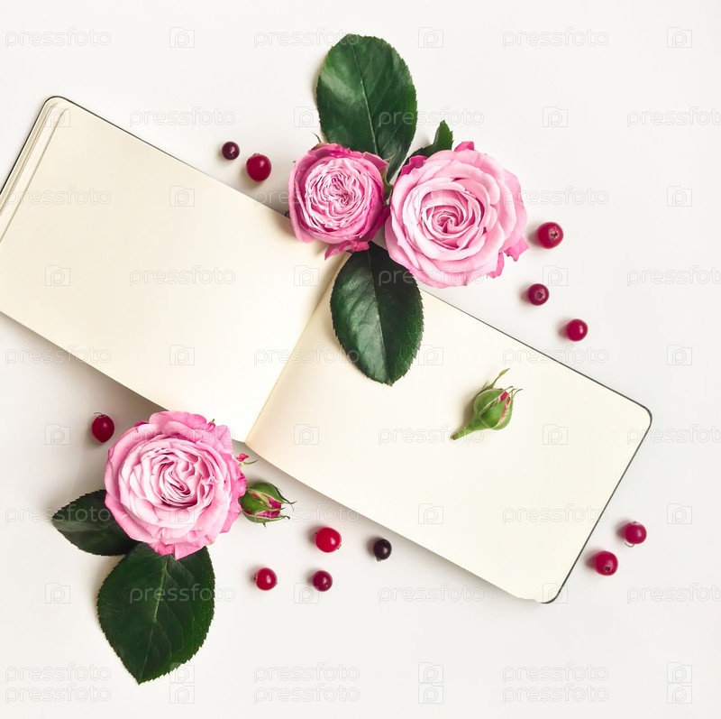 Красочная композиция с альбомом, розами и ягодами