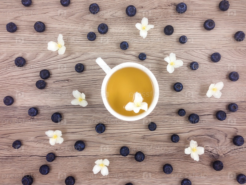 Чашка горячего зеленого чая, цветы и ягоды