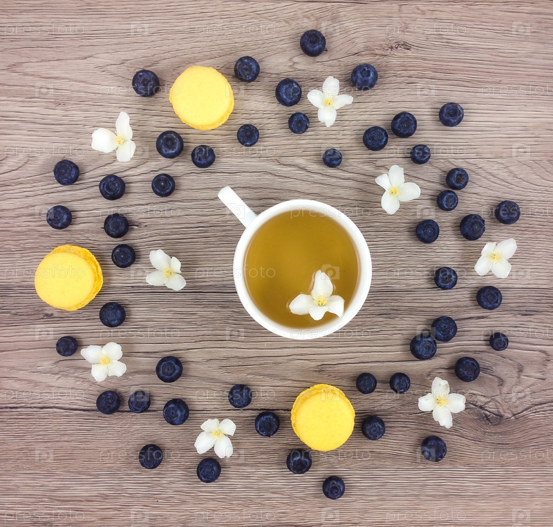 Чашка горячего зеленого чая, цветы и ягоды на деревянном столе