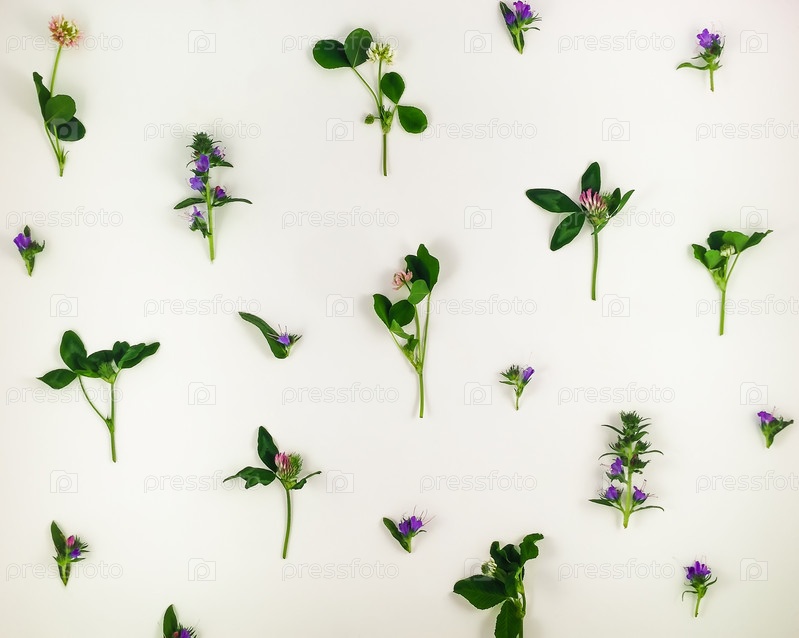 Красочные яркие картины диких луговых цветов на белом фоне