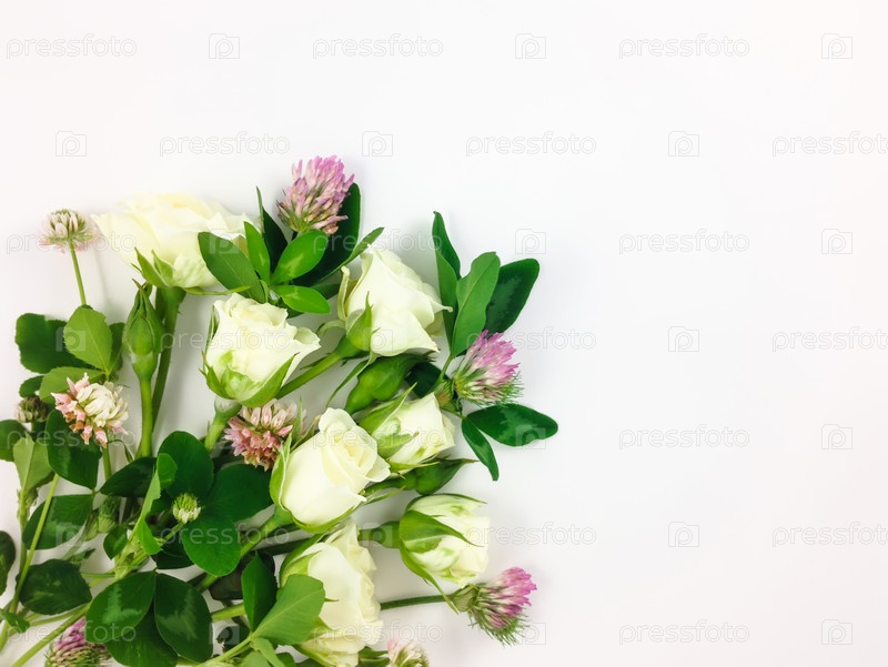 Красочный яркий букет из роз и клевера