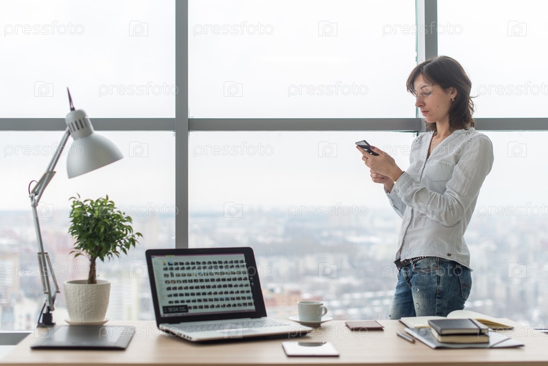 Женщина со смартфоном в офисе на своем рабочем месте