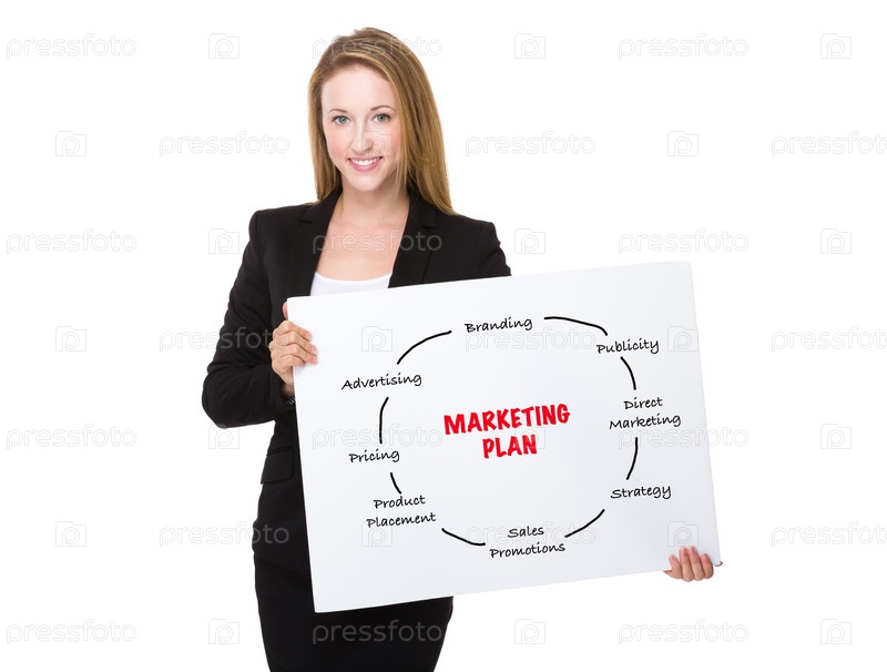 Бизнесмен с плакатом, показывая маркетинговое планирование