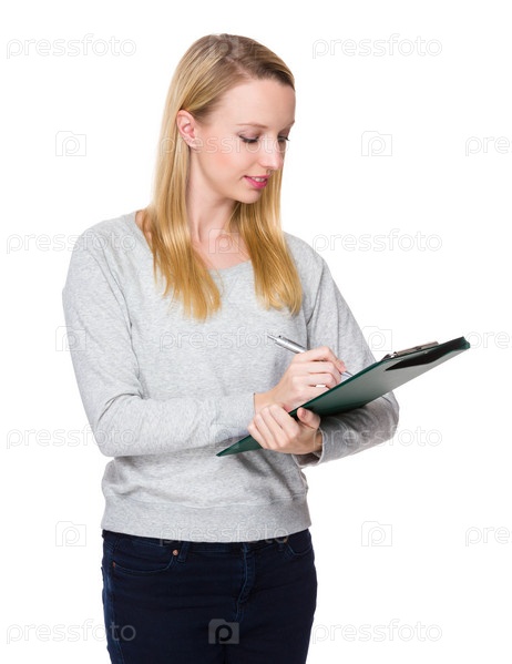 Молодая женщина пишет в планшет