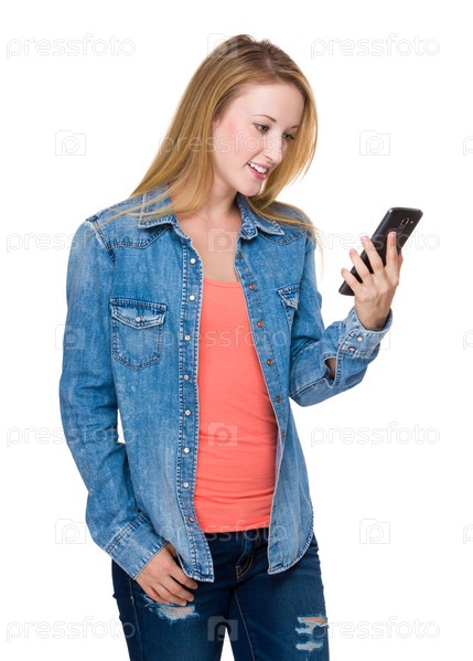 Женщина смотрит на сотовый телефон